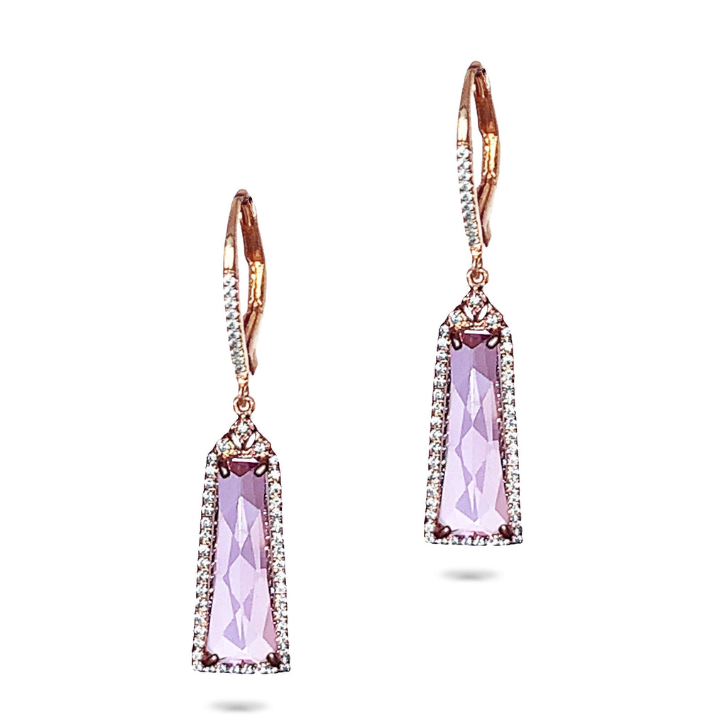 14k Gold Baguette Pink Amethyst Diamond Dangle Earrings ME23751