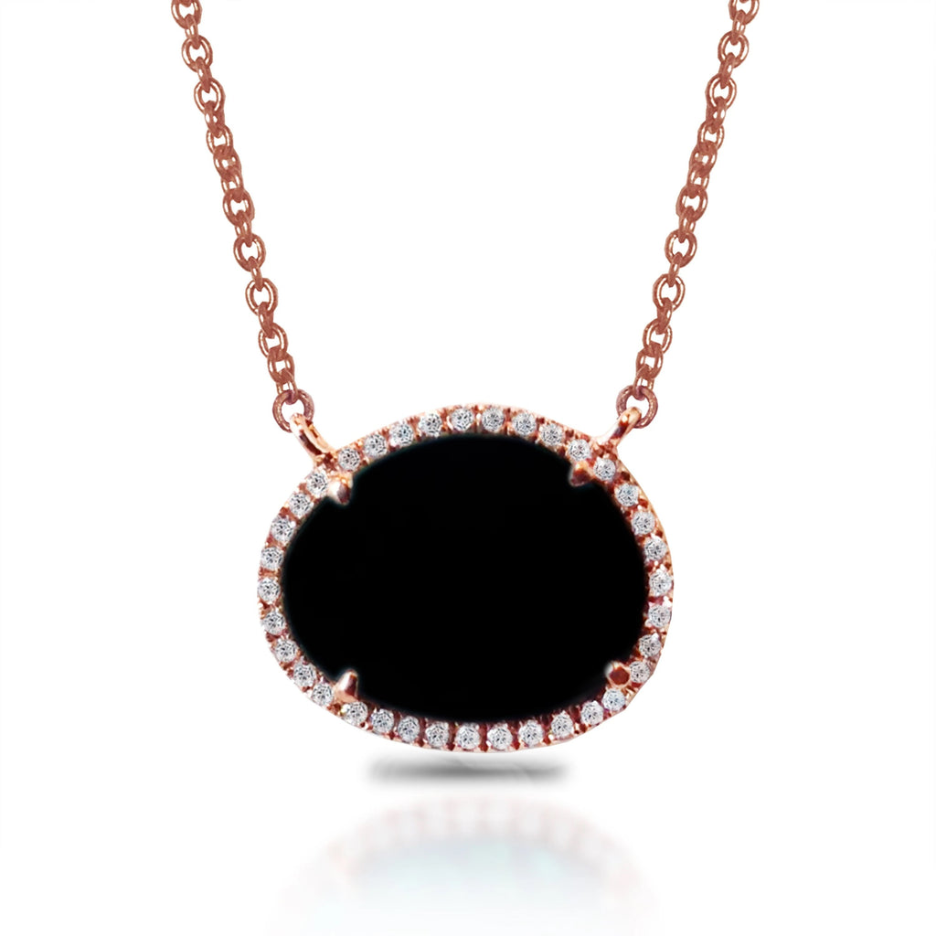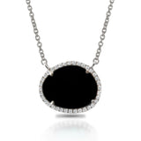 Uniquely hand crafted, this black onyx oval is surrounded by small brilliant diamonds in a halo design. Stack it with velvet radical necklaces for a chick layered look.